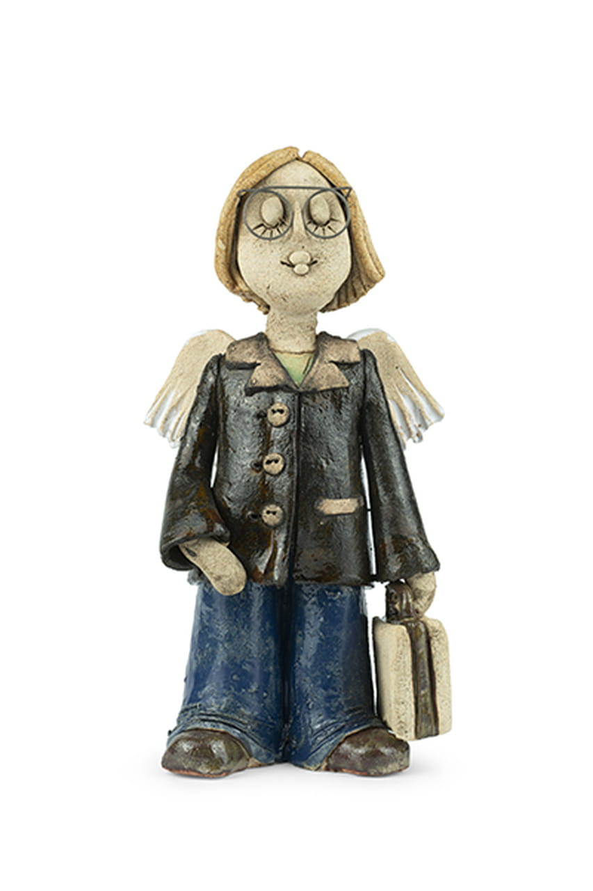 Na jego twarzy maluje się spokój i lekki uśmiech kogoś, kto widział już wiele, ale wciąż potrafi się dziwić. W oczach (choć zamkniętych) kryje się wdzięczność za każdą drogę, a skrzydła, subtelne i nieco zakurzone, przypominają, że nawet anioły potrzebują czasem odpoczynku po dalekich lotach. Dolnośląska artystka tchnęła w tę postać lekkość i humor – w jej glinianych dłoniach zwyczajność staje się poezją, a prosty gest – opowieścią.