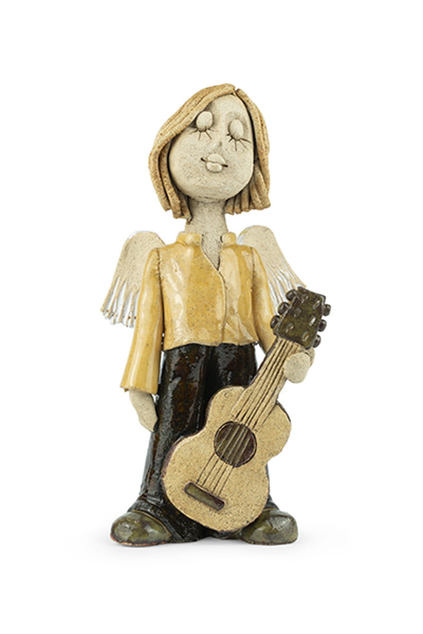 Ten anioł Muzykant zrodził się z gliny i wyobraźni – delikatny, a jednocześnie pełen życia, jak melodia, którą niesie jego gitara. W jego zamkniętych oczach kryje się spokój i pewność, że muzyka to język serca, który nie potrzebuje słów. Subtelne skrzydła, jakby utkane z porannego światła, niosą w sobie obietnicę lekkości, podczas gdy dłonie anioła obejmują instrument – wiernego towarzysza marzeń. Złocista koszula połyskuje niczym promień słońca, który przenika przez chmury po burzy, a ciemne spodnie i buty mocno osadzają go na ziemi – bo nawet anioły czasem stąpają między ludźmi.