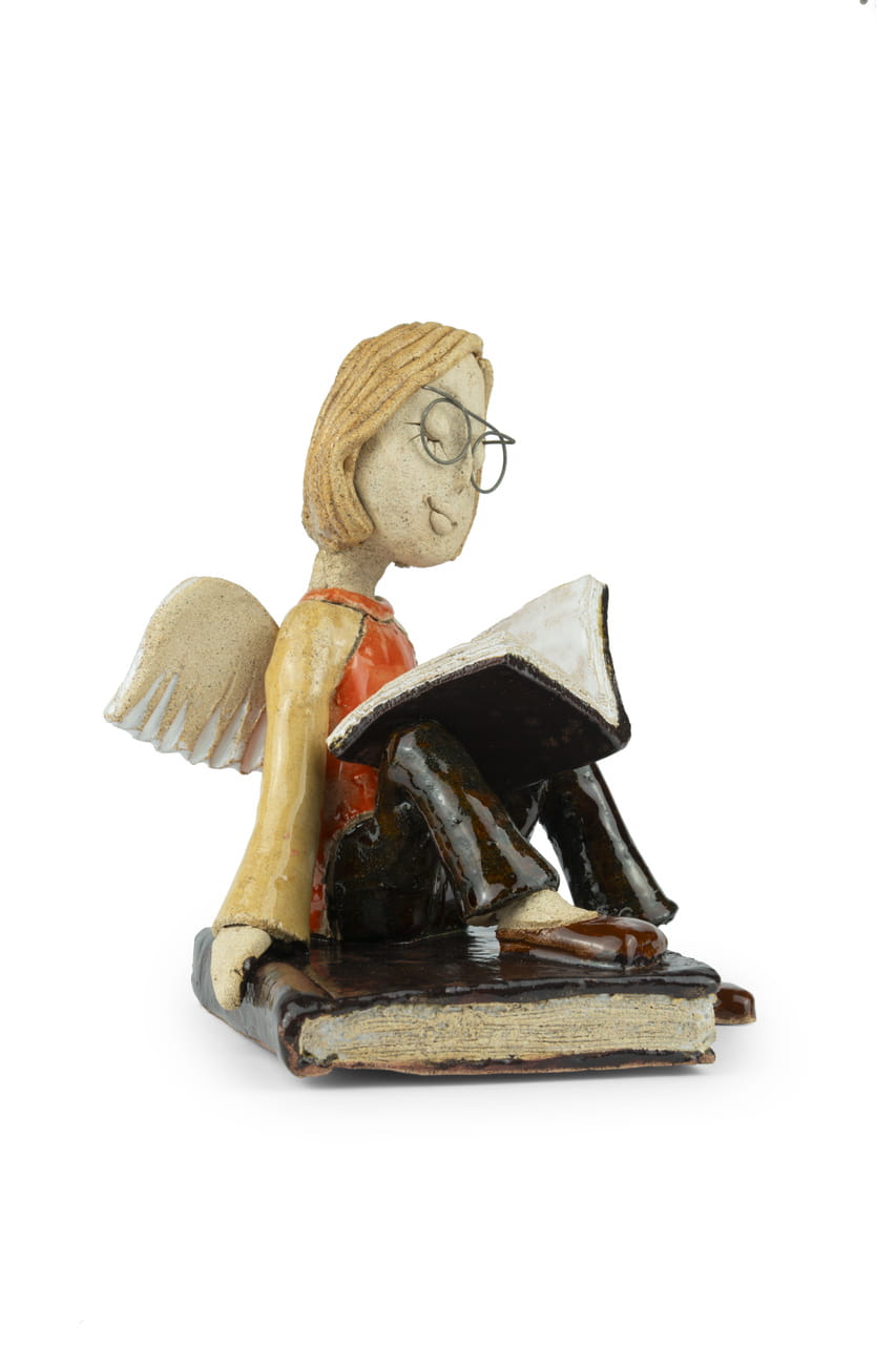 Ten uroczy anioł ceramiczny to prawdziwy hołd dla spokoju, refleksji i magii codziennych chwil. Wykonany z niezwykłą precyzją, zachwyca nie tylko formą, ale i emocjami, które w sobie niesie. Przedstawia anioła w okularach, pogrążonego w lekturze – siedzącego na wielkiej księdze, jakby właśnie odkrywał tajemnice świata ukryte między kartkami. Jego przymknięte oczy i delikatny uśmiech emanują spokojem, mądrością i radością z prostych przyjemności.