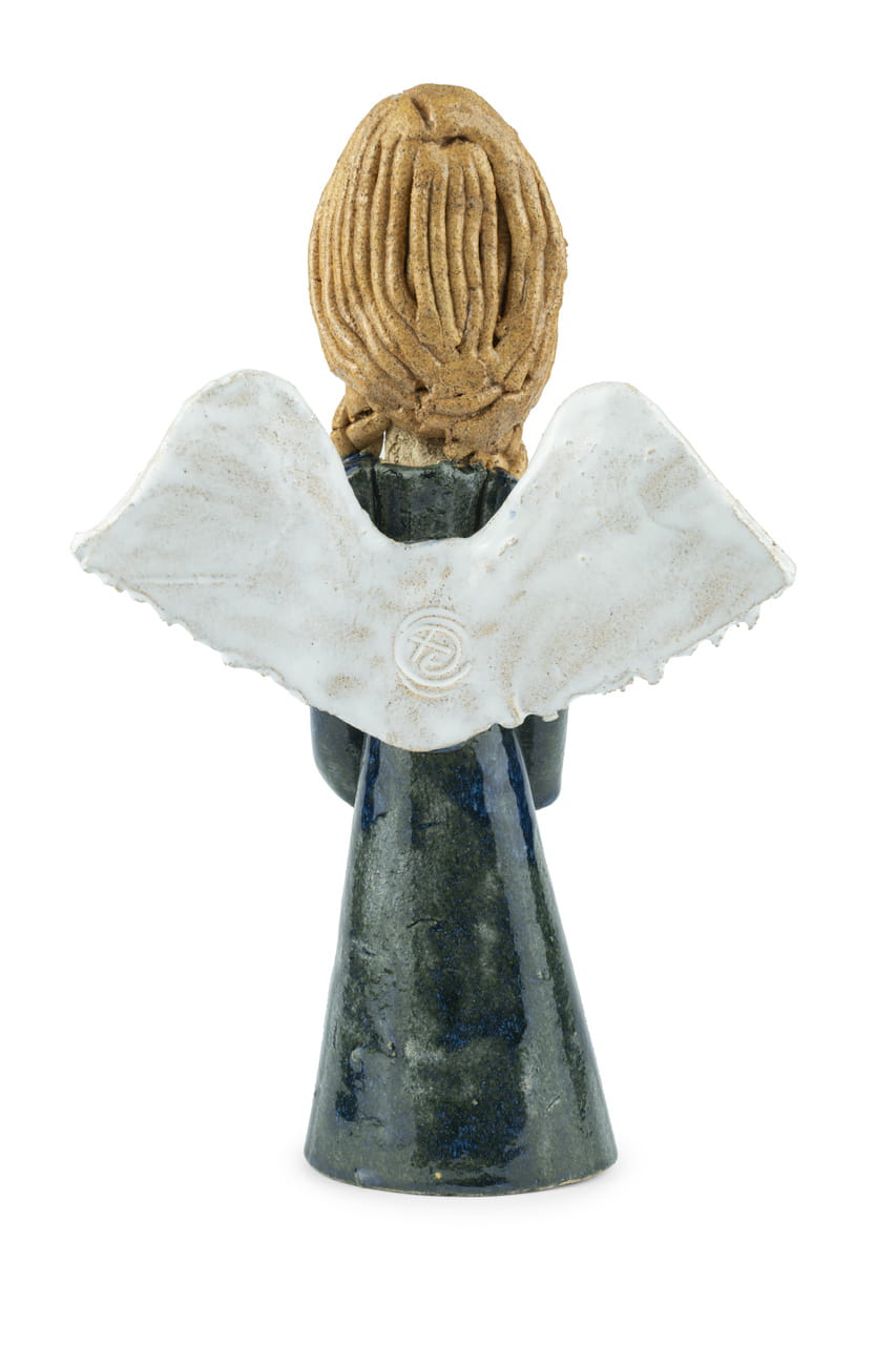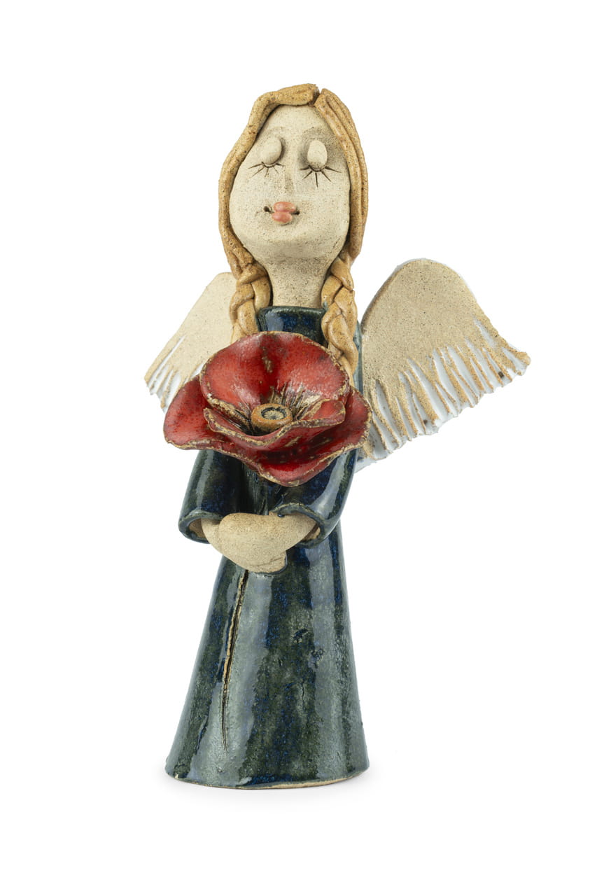 Ten niezwykły anioł ceramiczny to kwintesencja delikatności, spokoju i ciepła, jakie potrafi przynieść tylko prawdziwe polskie rękodzieło. Wykonany z dbałością o każdy szczegół, zachwyca subtelnym wyrazem twarzy – zamknięte oczy i lekko uniesione usta sprawiają, że wydaje się pogrążony w cichej modlitwie lub wdzięczności za piękno świata. W dłoniach trzyma czerwony kwiat, który kontrastuje z pastelowym błękitem jego szaty – symbol miłości, życia i nadziei, wprowadzający do wnętrza odrobinę magii i emocji.