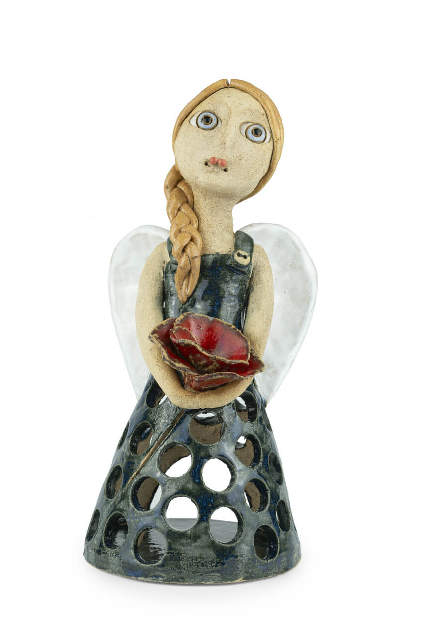 Ten anioł–lampion ceramiczny to prawdziwa perła polskiego rękodzieła — połączenie artystycznej wrażliwości, symboliki i ciepła domowego światła. Wykonany z naturalnej gliny, urzeka swoją subtelnością i charakterem. Jego spojrzenie, pełne zadumy i spokoju, przyciąga uwagę, jakby skrywał w sobie cichą modlitwę lub szept dobrych życzeń. W dłoniach trzyma czerwony kwiat – symbol życia, miłości i wdzięczności, którego intensywna barwa pięknie kontrastuje z głębokim granatem sukni.