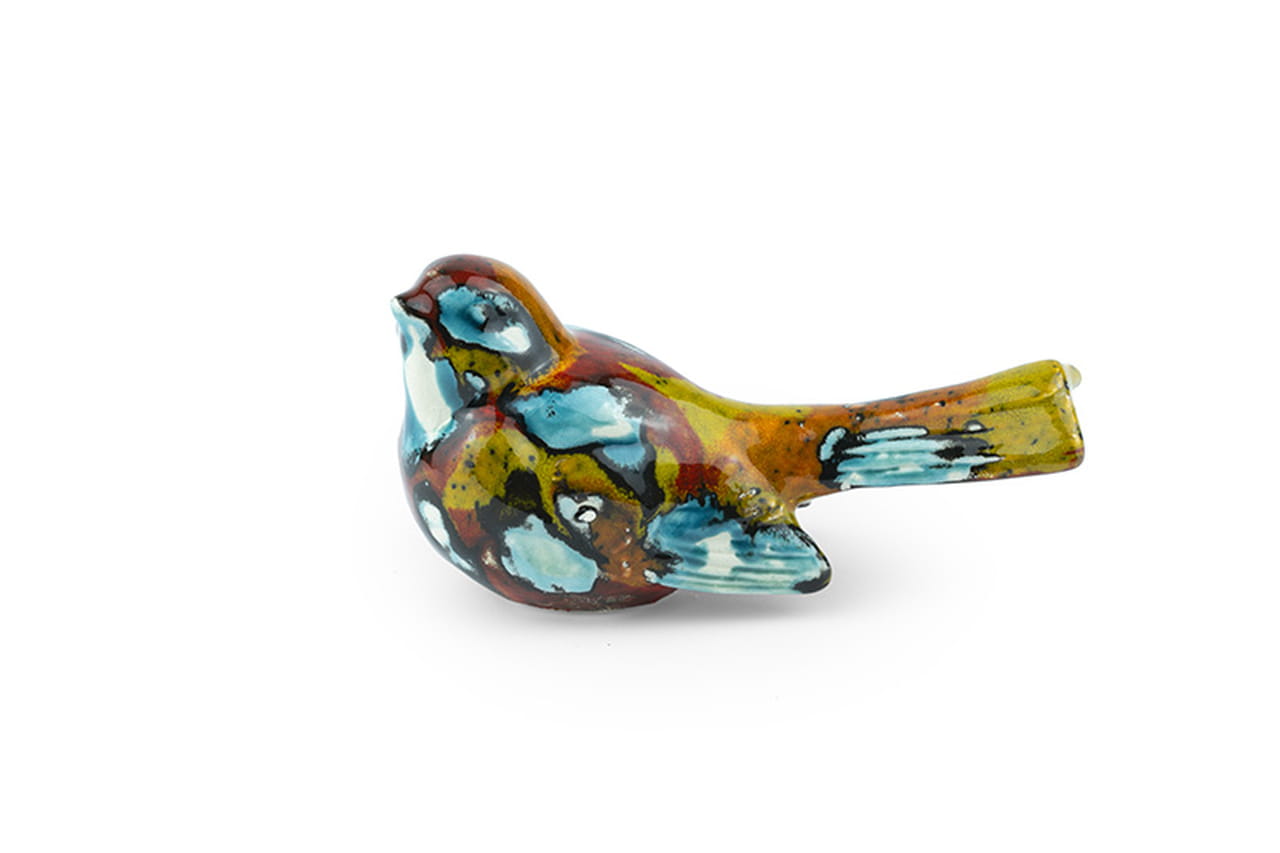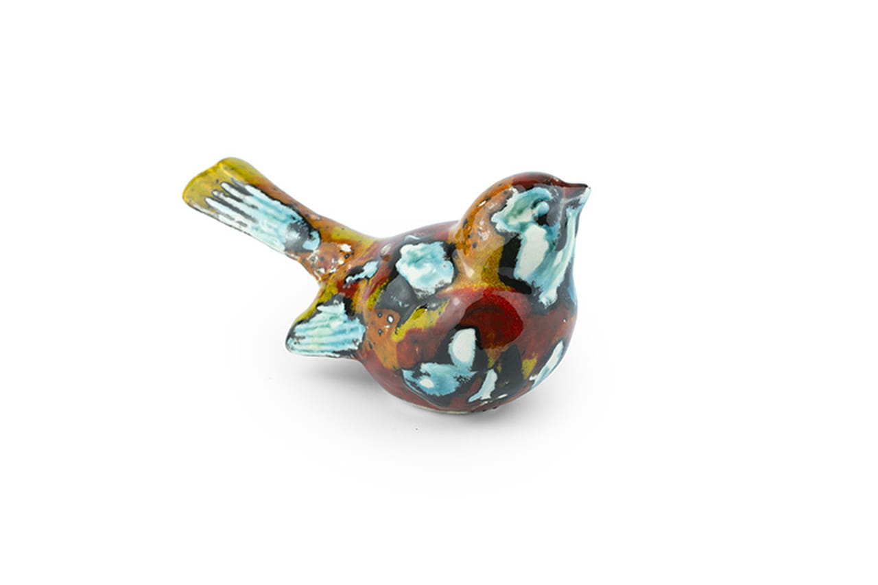 Ten urokliwy ceramiczny ptaszek to małe dzieło sztuki, które od razu przyciąga wzrok swoim niepowtarzalnym charakterem. Ręcznie wykonany i starannie szkliwiony, zachwyca połączeniem żywych barw – błękitów, żółci, zieleni i głębokich czerwieni – które tworzą na jego powierzchni wyjątkowy, niemal malarski efekt. Każda plamka koloru i każde przejście tonalne są wynikiem ręcznej pracy, dzięki czemu nie ma dwóch identycznych egzemplarzy. To sprawia, że ptaszek jest nie tylko dekoracją, ale też małym, unikalnym elementem sztuki użytkowej.