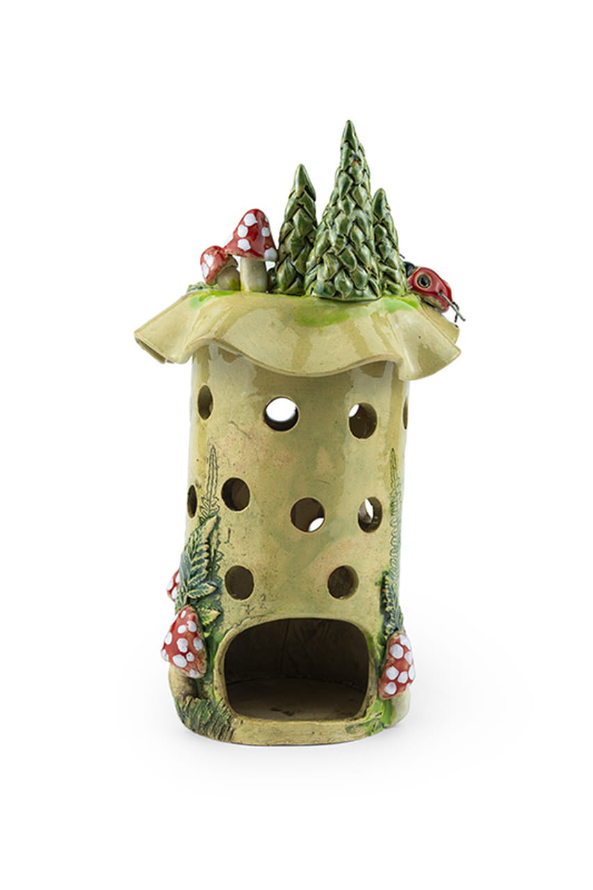 Ręcznie wykonany ceramiczny lampion w bajkowym stylu, ozdobiony misternymi detalami. Konstrukcja przypomina pień leśnego drzewa, udekorowany reliefami paproci oraz czerwonymi muchomorami. Na górze lampionu znajduje się miniaturowa leśna sceneria – małe choinki, oczko wodne oraz urocza biedronka, które dodają całości wyjątkowego, magicznego charakteru.