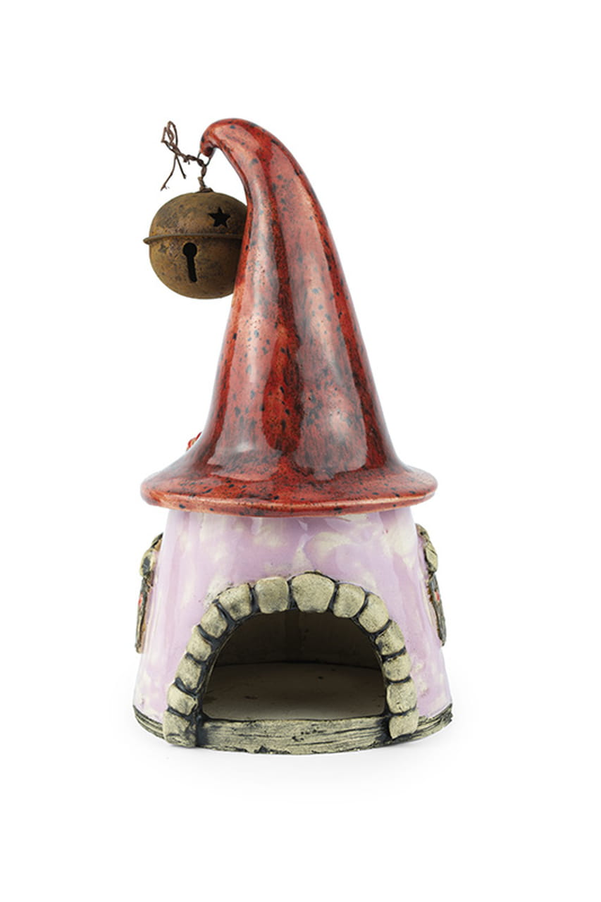 Ten uroczy ceramiczny lampion w formie bajkowego domku przenosi prosto do świata magii i beztroskich opowieści. Jego ręcznie formowana bryła, zdobiona kamienną fakturą drzwi, maleńkimi okiennicami z serduszkami oraz kolorowymi kwiatami u podstawy, sprawia wrażenie, jakby został wyciągnięty z leśnej polany zamieszkałej przez wróżki. Całość dopełnia wysoki, czerwony dach w fantazyjnym kształcie, zwieńczony dzwoneczkiem i ozdobiony serduszkowym wycięciem, przez które po zapaleniu świeczki subtelnie wydobywa się światło.