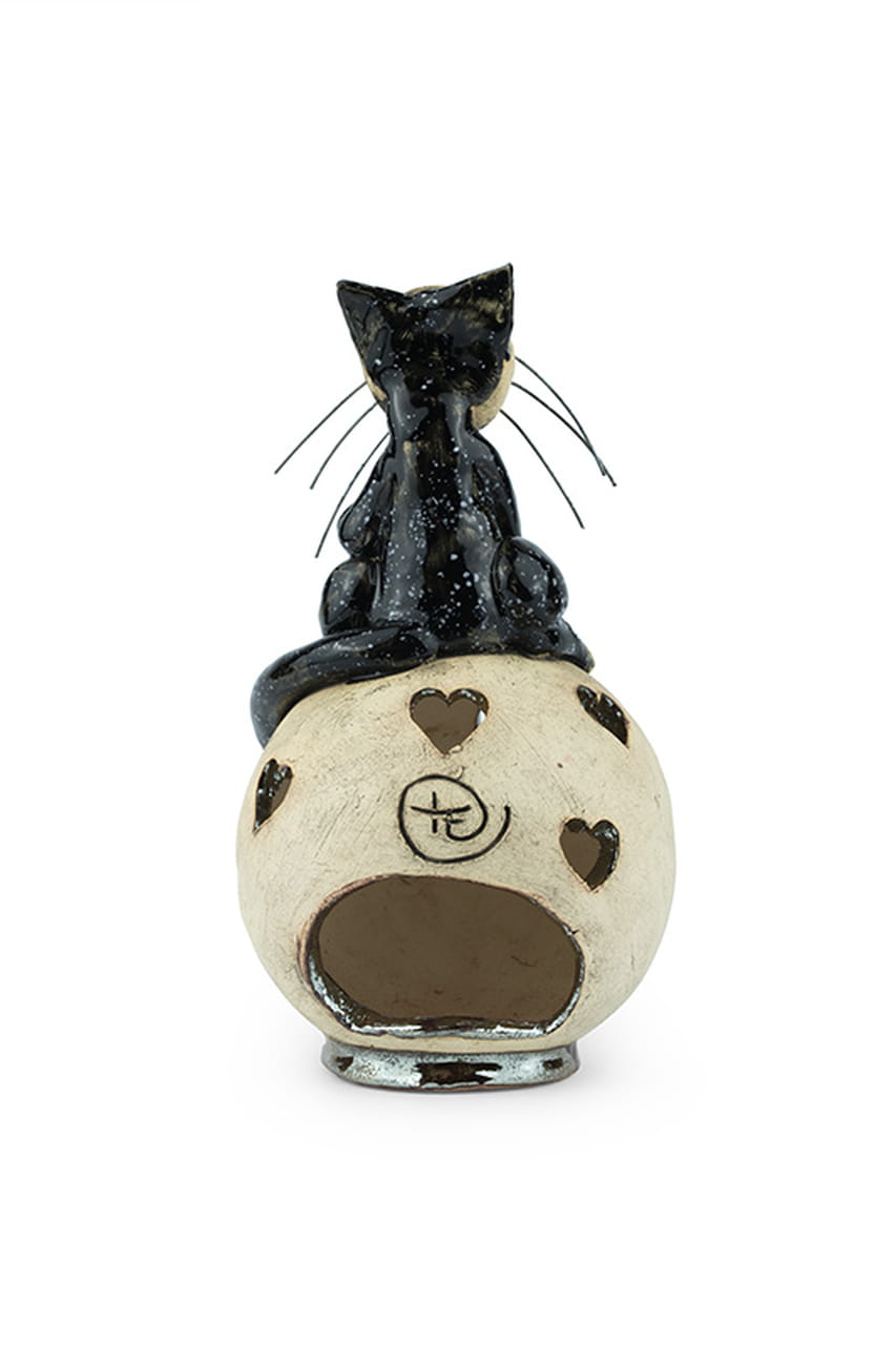 Kot siedzi dumnie na jasnej, kulistej podstawie z wyciętymi otworami w kształcie serc, z których jedno wypełnione jest czerwonym, błyszczącym elementem nadającym całości romantycznego akcentu. Jego czarne, lekko połyskujące futerko, kontrastujące białe łapki oraz długie, metalowe wąsy tworzą uroczą, pełną życia kompozycję. Zamknięte oczy i spokojny uśmiech nadają figurce charakter zadumanego strażnika domowego ciepła.