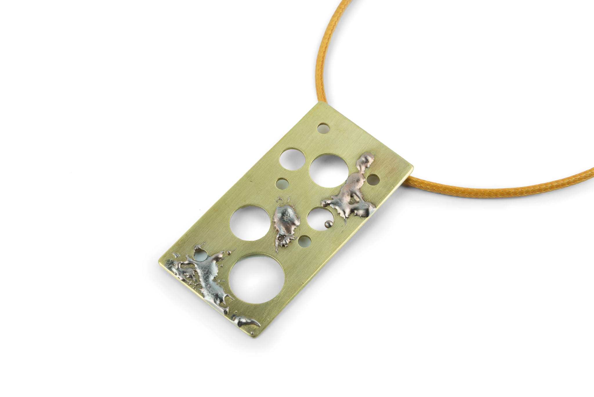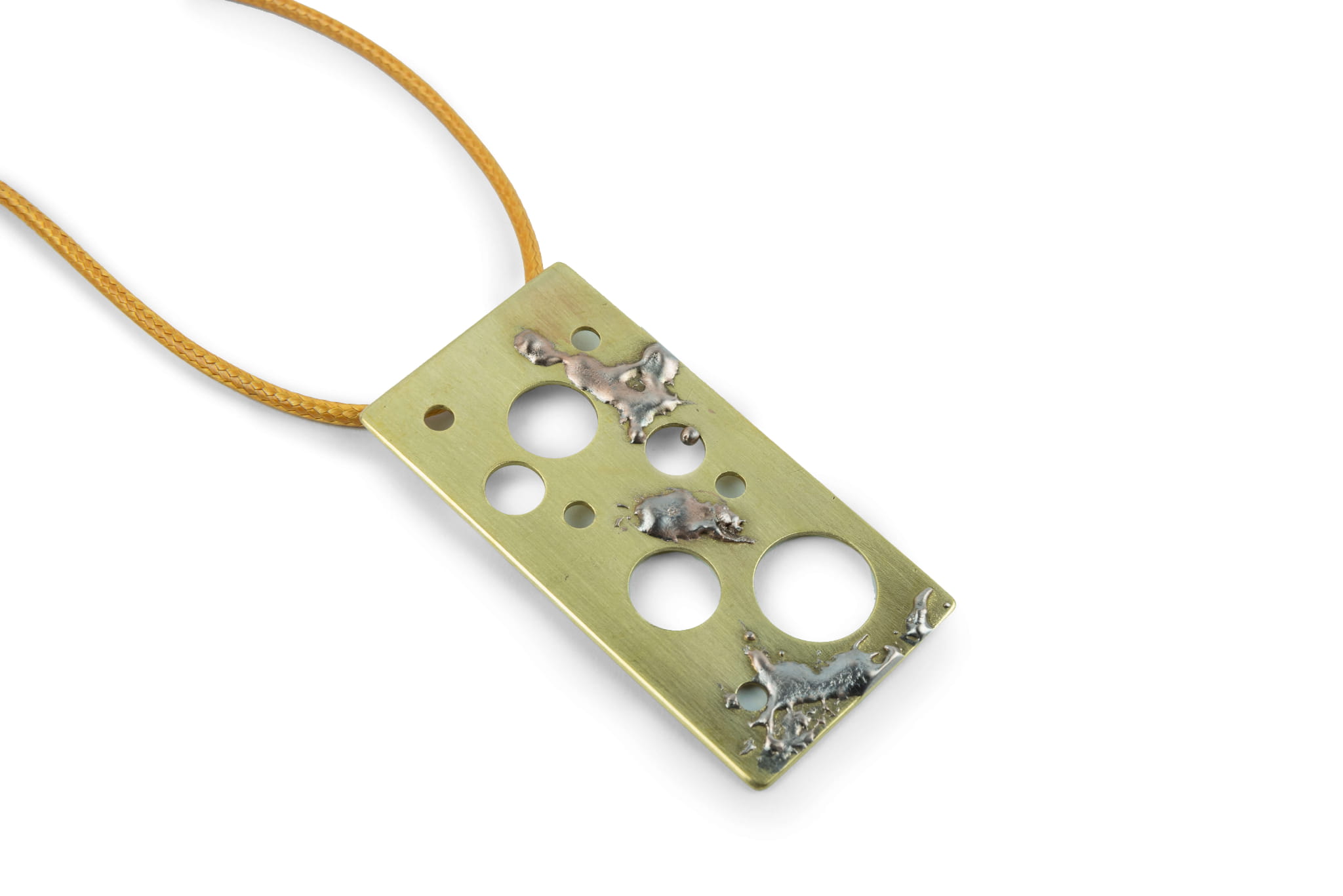 Wygląd tej zawieszki wykonanej z mosiądzu jest jak spacer po nowatorskiej, choć sięgającej do tradycyjnych metod galerii. Jego niejednoznaczny wyraz skradnie serca prawdziwym artystom. Dziury o wielorakich wymiarach, pląsy powstałe z zimnego lutu. Dużo dzieje się na tej jednej, niewielkiej ozdobie. Wszystko to podkreślone zostało głębokim odcieniem naturalnego mosiądzu.